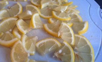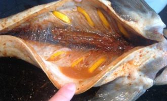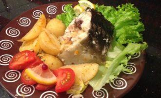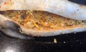 Рыбу натереть специями, сделать надрезы в брюшке и вставить туда лимон. Оставить пропитаться.