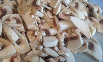 Пока сделаем фарш: шампиньоны порезать и обжарить на растительном масле.