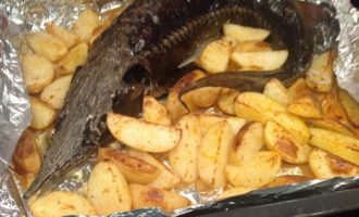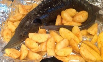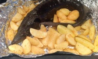 Картофель порезать на четвертинки, смешать со специями. Выложить рыбу и картофель на противень с фольгой.