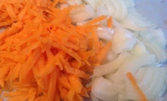 Порезать лук, морковь натереть на крупной терке и жарить вместе с грибами.