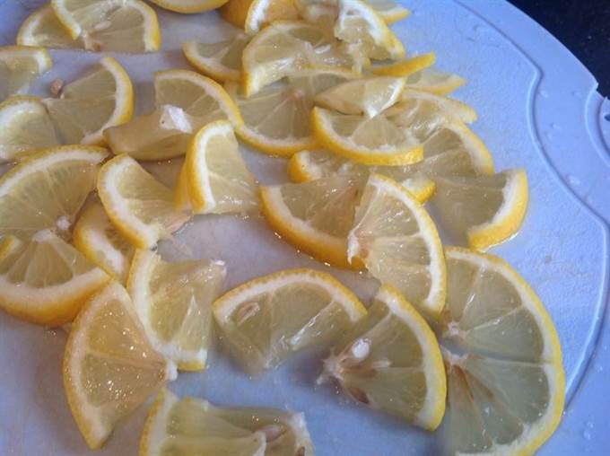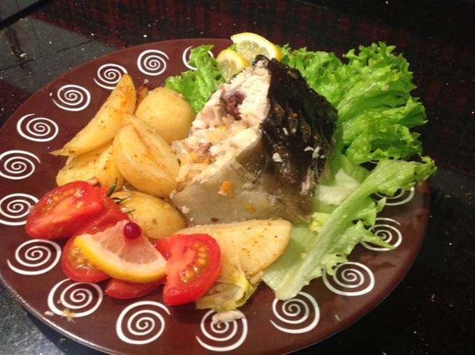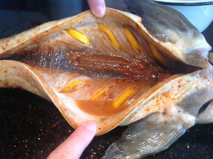 Рыбу натереть специями, сделать надрезы в брюшке и вставить туда лимон. Оставить пропитаться.