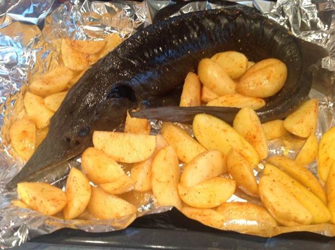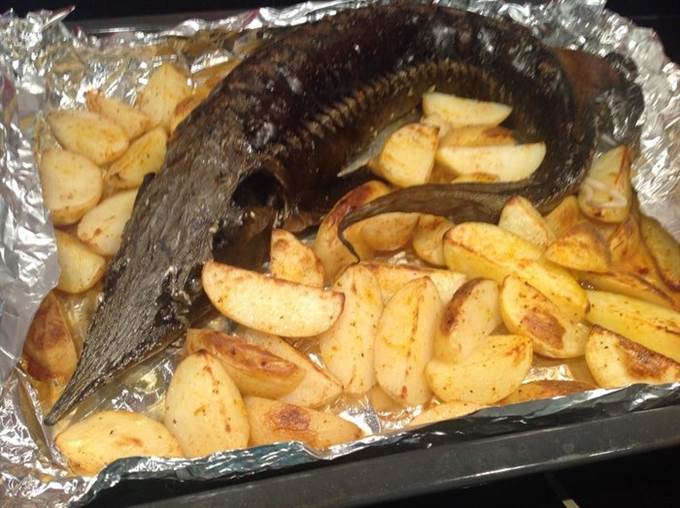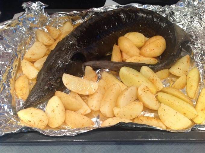 Картофель порезать на четвертинки, смешать со специями. Выложить рыбу и картофель на противень с фольгой.