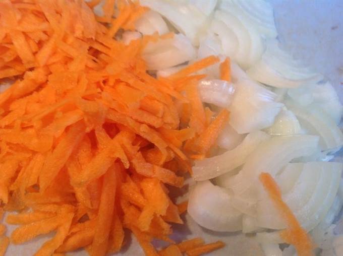 Порезать лук, морковь натереть на крупной терке и жарить вместе с грибами.