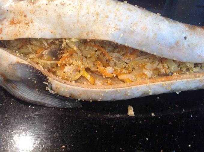 Зафаршировать рыбу и зашить брюшко, или скрепить зубочистками.