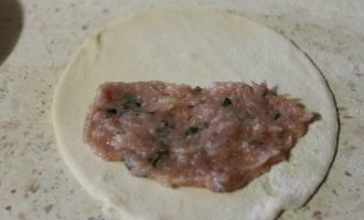 • Отщипываем небольшие кусочки теста и раскатываем их, вырезаем блюдцем кружок, кладем начинку на одну сторону, а сверху прикрываем другой. Придавливаем края пальчиком, а потом прижимаем вилкой.