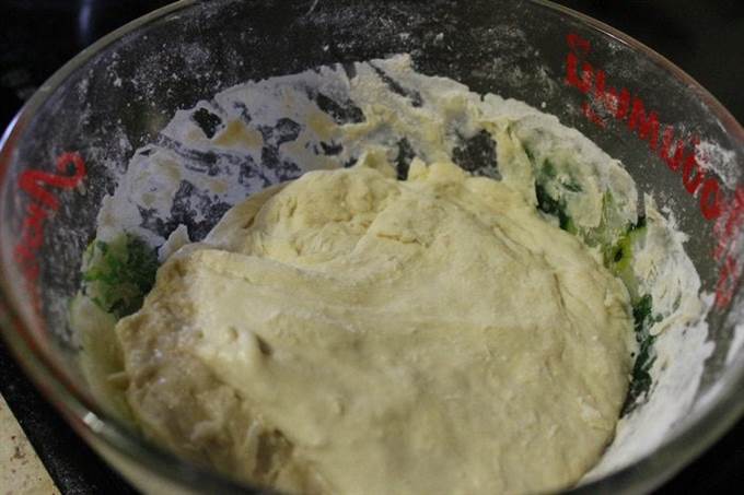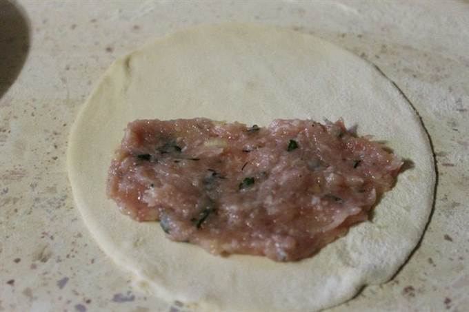 • Для начинки, вы можете взять Ваш любимый состав фарша. У меня был 50/50 свинина и курица перекрученный один раз. Фарш посолить и поперчить по вкусу. Добавить половинку луковицы порезанную мелким кубиком, также зелень мелко рубленную и воду. Все тщательно перемешать.