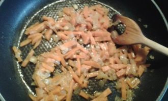 Лук мелко порезать, обжарить с 1-й ст.л. масла 2-3 минуты. Добавить порезанную соломкой морковь. Влить 4-5 ст.л. воды, тушить под закрытой крышкой, периодически помешивая, до готовности.