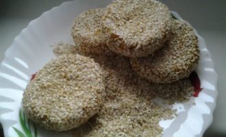 Для панировки смешать овсяные отруби и кунжут. Сформировать котлетки, обвалять в панировке.