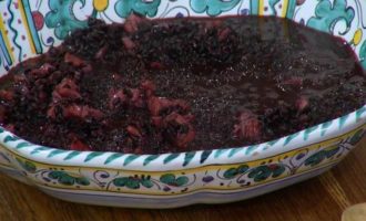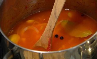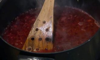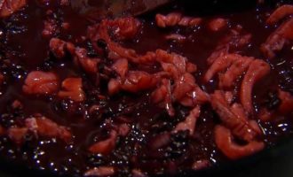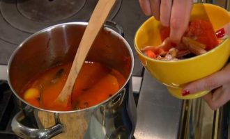 • Влить вино и дать алкоголю выпариться, затем добавить бадьян, лавровый лист, гвоздику, душистый перец, можжевельник, пеперончино и залить все примерно двумя литрами горячей воды.