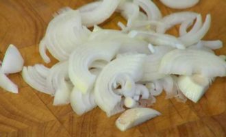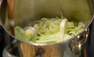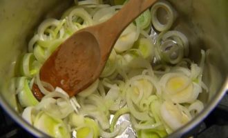 • Светлую часть порея порезать кольцами, добавить в кастрюлю с луком, перемешать и обжарить.