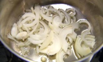 • Приготовить бульон: разогреть в глубокой кастрюле 1 ст. ложку оливкового масла и слегка обжарить лук.