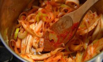 • Добавить томатную пасту, все перемешать и обжаривать овощи, пока они не станут мягкими, затем посолить.