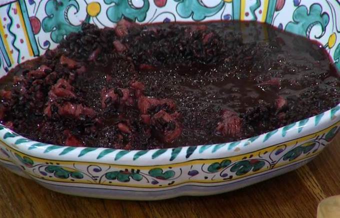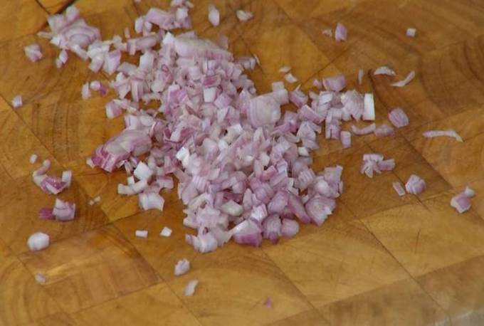 • Приготовить рис: разогреть в сковороде оливковое и сливочное масло и обжарить шалот с чесноком. Когда лук станет прозрачным, всыпать в сковороду рис и, помешивая, обжаривать около минуты, затем добавить вино и на сильном огне дать алкоголю выпариться. Влить через сито немного рыбного бульона и готовить рис на медленном огне до готовности, доливая бульон по мере выкипания.