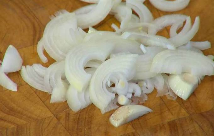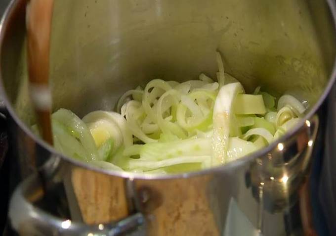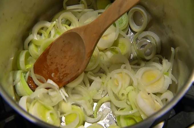 • Светлую часть порея порезать кольцами, добавить в кастрюлю с луком, перемешать и обжарить.