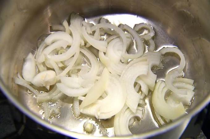 • Приготовить бульон: разогреть в глубокой кастрюле 1 ст. ложку оливкового масла и слегка обжарить лук.