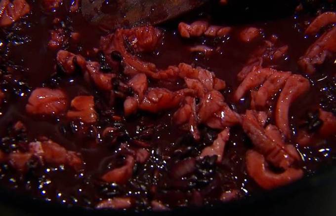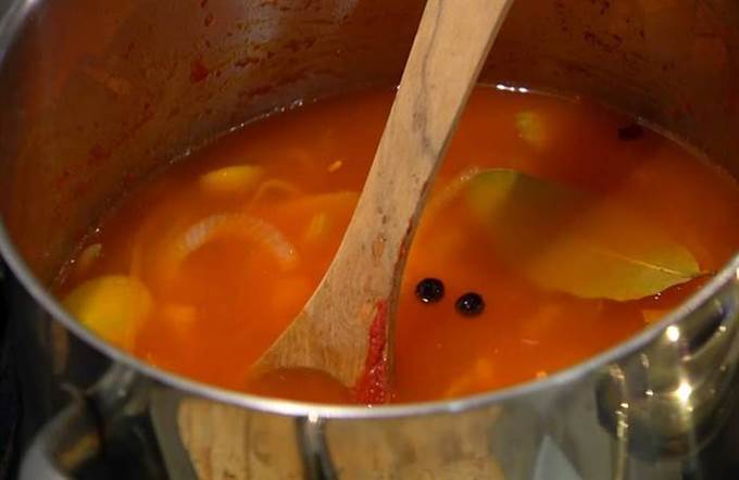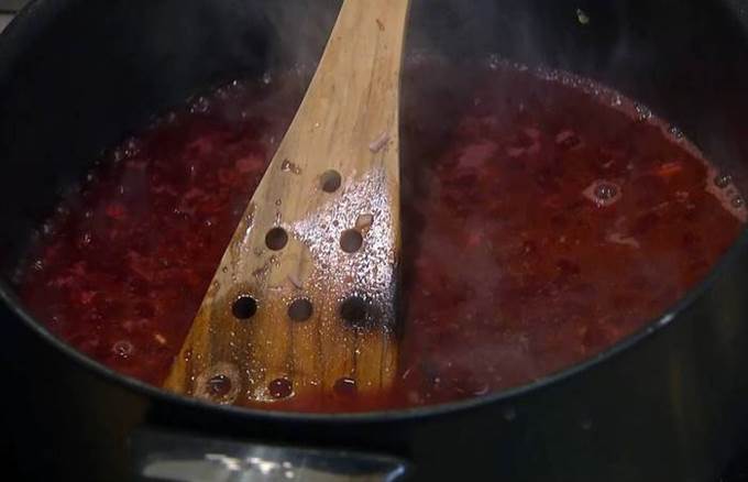 • Влить вино и дать алкоголю выпариться, затем добавить бадьян, лавровый лист, гвоздику, душистый перец, можжевельник, пеперончино и залить все примерно двумя литрами горячей воды.