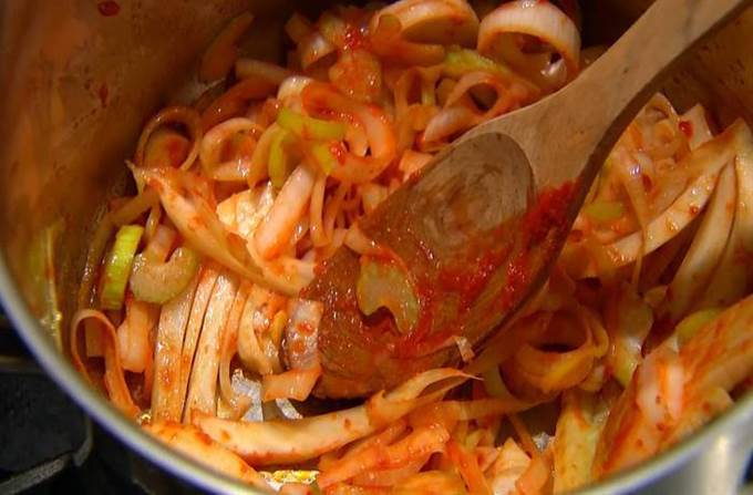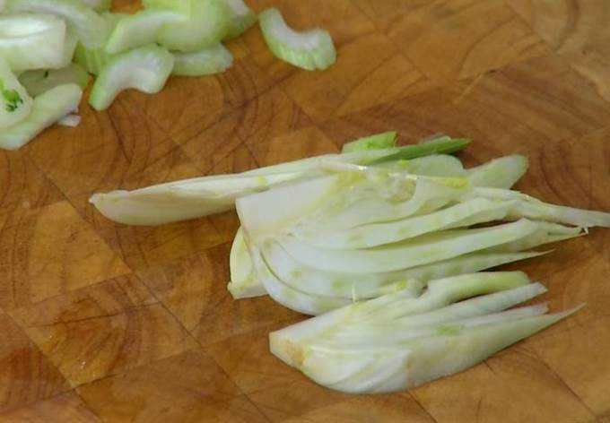 • Сельдерей и фенхель выложить к луку и обжарить все до прозрачности.