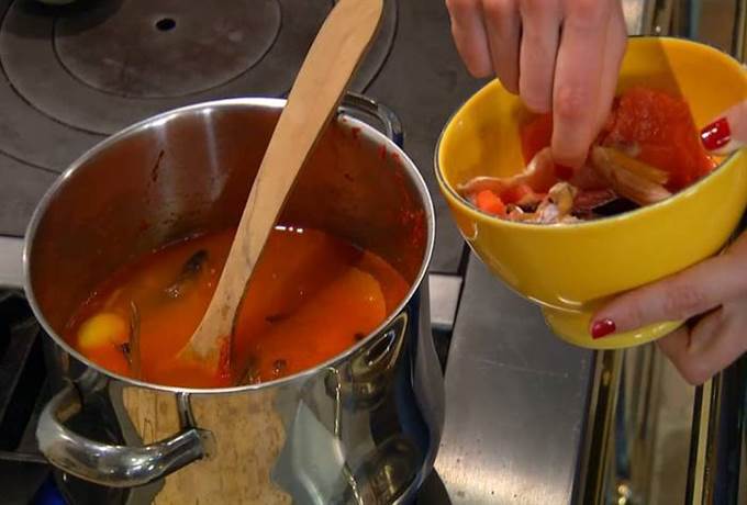 • В кастрюлю с овощами и специями выложить кусочки рыбы для бульона и довести до кипения (но не кипятить!), затем убавить огонь и варить минут семь.