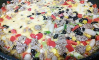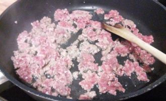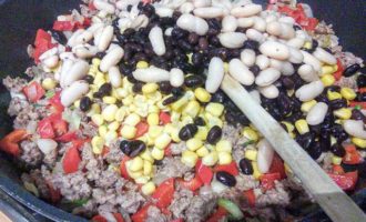 Первым делом через дуршлаг слить жидкость с фасоли и кукурузы, промыть под холодной водой. На сковороде разогреть масло, обжарить фарш, раздрабливая его с помощью деревянной ложки, чтобы не было крупных комочков.