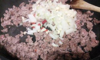 Добавить мелко рубленный лук, чеснок и перец чили (предварительно удалив из него перепонки и семена (остроту регулируйте по своему вкусу). Обжарить вместе в течение нескольких минут. Посолить и поперчить.