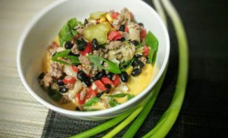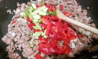 Добавить нарезанный мелким кубиком перец и кружочком зеленый лук (небольшое количество лука оставьте для подачи), обжарить вместе в течение нескольких минут.