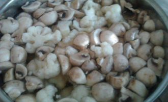 Вымыть все овощи. Вскипятить воду. Капусту промыть, разобрать на соцветия. Грибы также промыть и порезать на 2-4 части. В кипящую воду положить капусту и грибы и варить 3-5 минут.