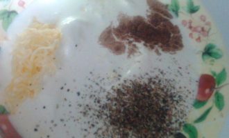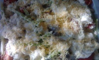 Сливки смешать с натертым сыром и специями и залить равномерно овощи.
