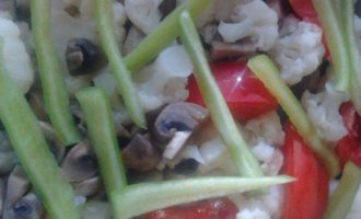 С отварных овощей слить воду. Все овощи переложить в форму.