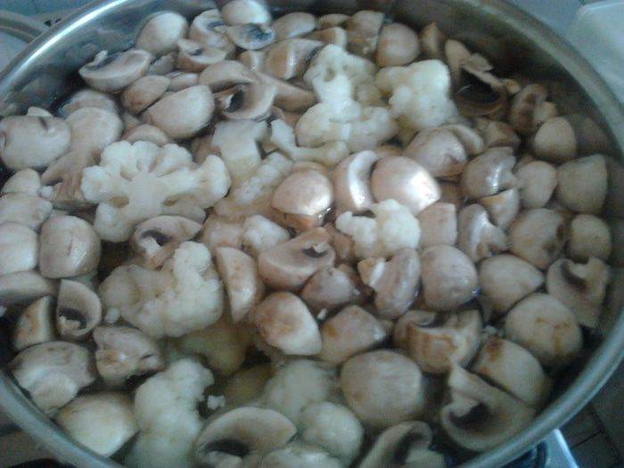 Вымыть все овощи. Вскипятить воду. Капусту промыть, разобрать на соцветия. Грибы также промыть и порезать на 2-4 части. В кипящую воду положить капусту и грибы и варить 3-5 минут.