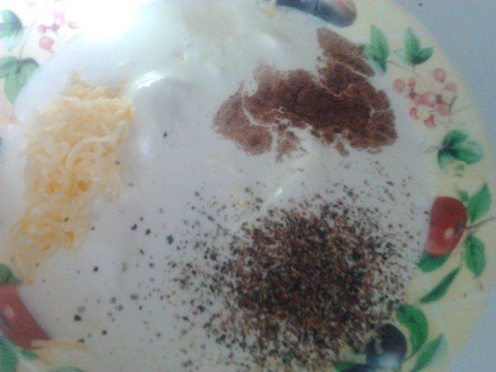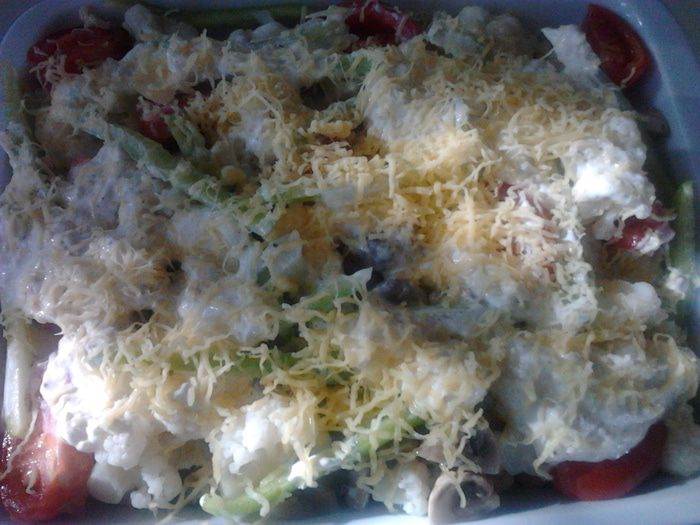 Сливки смешать с натертым сыром и специями и залить равномерно овощи.