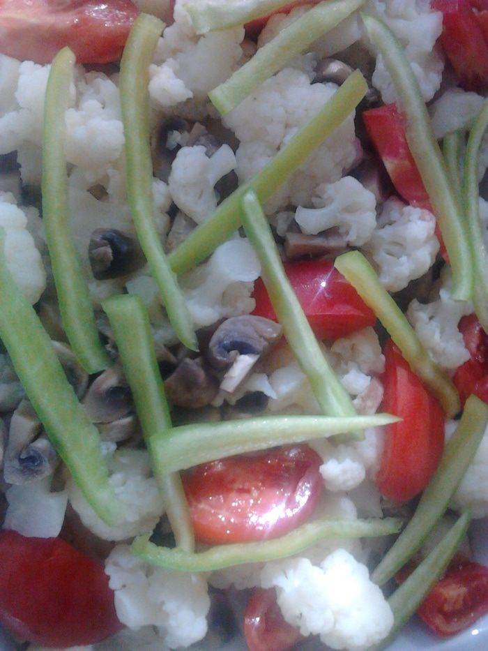 Помидоры порезать на 4 части, перец соломкой. Смазать форму оливковым маслом.