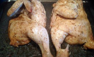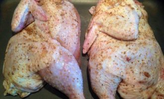 Цыпленка разрезать по грудке и спинке на 2 части. Тщательно натереть со всех сторон Сванской солью. Желательно поставить под гнет или использовать вакуумный контейнер. Поставить мариноваться на ночь.