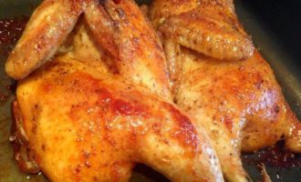 Прибавить температуру в духовке до 170 градусов и довести цыпленка, постоянно поливая соком, до готовности.