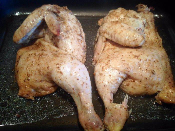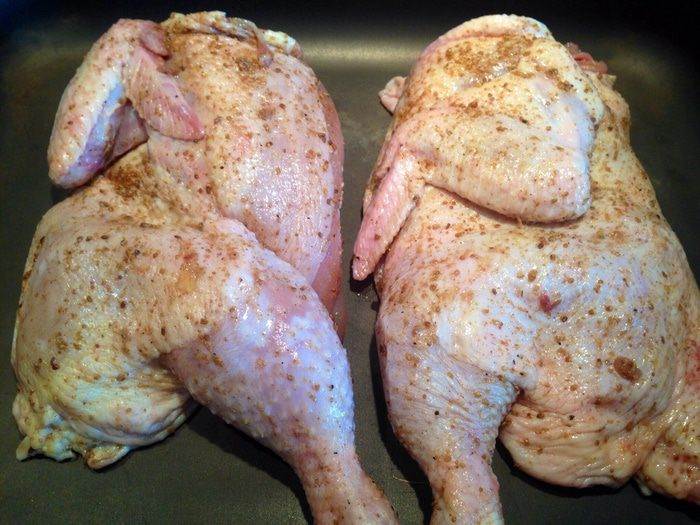 Цыпленка разрезать по грудке и спинке на 2 части. Тщательно натереть со всех сторон Сванской солью. Желательно поставить под гнет или использовать вакуумный контейнер. Поставить мариноваться на ночь.