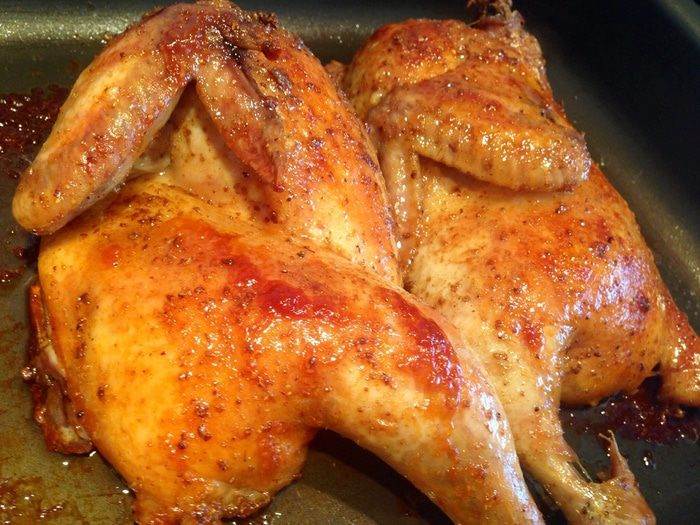 Прибавить температуру в духовке до 170 градусов и довести цыпленка, постоянно поливая соком, до готовности.