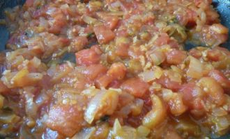 Разогреть масло на сковороде и обжарить лук до прозрачности. Измельчить чеснок. К луку добавить помидоры и чеснок с базиликом. Приправить с солью и перцем. Потушить? помешивая минуты 3. Снизить огонь и потушить минут 6. -