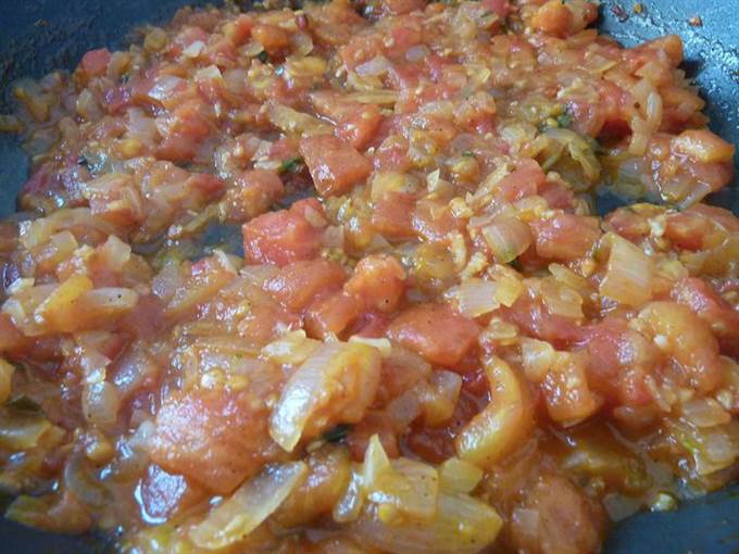 Разогреть масло на сковороде и обжарить лук до прозрачности. Измельчить чеснок. К луку добавить помидоры и чеснок с базиликом. Приправить с солью и перцем. Потушить? помешивая минуты 3. Снизить огонь и потушить минут 6. -
