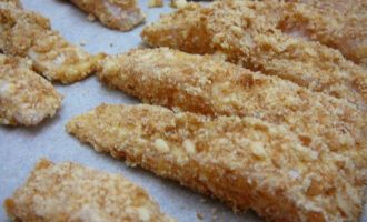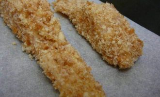 Выложить запанированную рыбу на противень застеленный пергаментом.