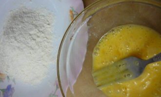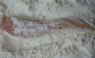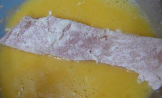 Кусочек рыбы обвалять сначала в муке, лишнюю стряхнуть.