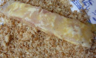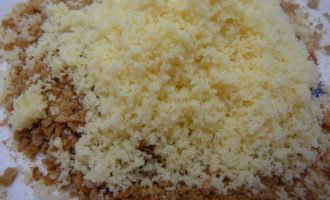 Сухарную крошку смешать с сыром мелконатертым «Пармезаном» или уже готовым сыром»Паэсано». Добавить горсть мелко молотого миндаля. Перемешать.