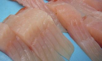 Нарезать филе полосками в ширину около 1 см. Посолить и поперчить.