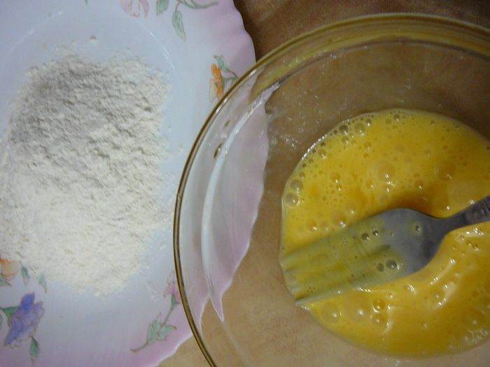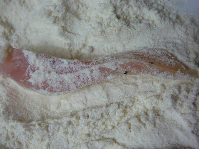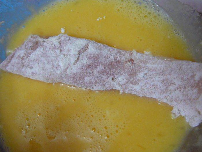 Кусочек рыбы обвалять сначала в муке, лишнюю стряхнуть.