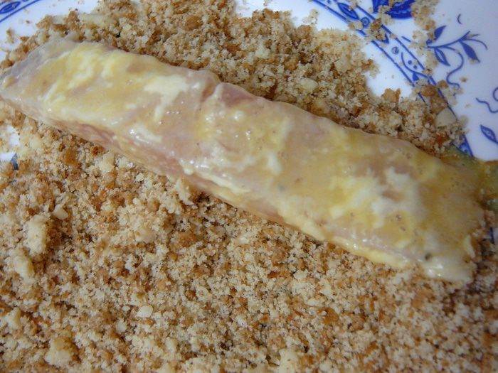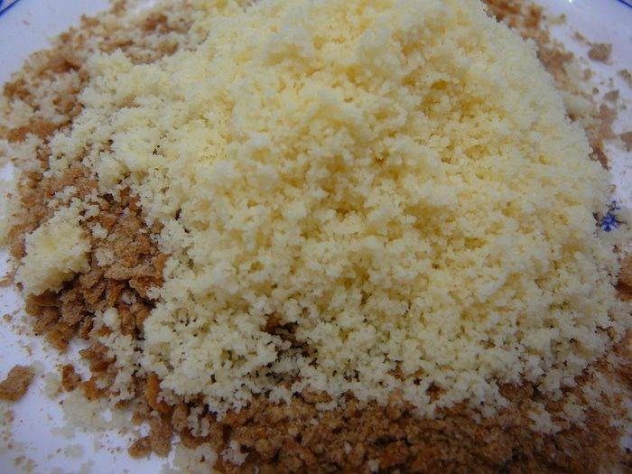 Сухарную крошку смешать с сыром мелконатертым «Пармезаном» или уже готовым сыром»Паэсано». Добавить горсть мелко молотого миндаля. Перемешать.