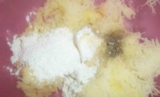 На мелкой терке натираем картофель, добавляем соль, перец, муку, яйцо.