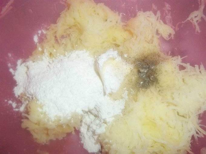 На мелкой терке натираем картофель, добавляем соль, перец, муку, яйцо.