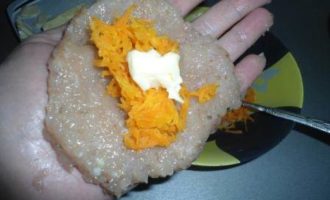 • Делаем наши котлетки. Берем кусочек фарша, делаем лепешку, выкладываем начинку и кусочек сливочного масла, заделываем начинку вовнутрь.