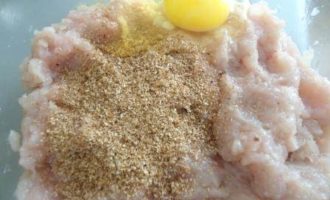 Кусочек черствого хлеба замочить в молоке или воде на 10 минут. Куриный фарш (у меня из куриного филе, лука и чеснока) смешать с хлебом, отрубями и яйцом, посолить, поперчить, хорошо вымешать, оставить на 10 минут.