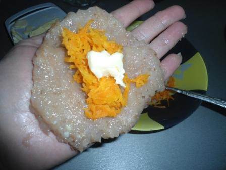 • Делаем наши котлетки. Берем кусочек фарша, делаем лепешку, выкладываем начинку и кусочек сливочного масла, заделываем начинку вовнутрь.