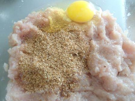 Кусочек черствого хлеба замочить в молоке или воде на 10 минут. Куриный фарш (у меня из куриного филе, лука и чеснока) смешать с хлебом, отрубями и яйцом, посолить, поперчить, хорошо вымешать, оставить на 10 минут.