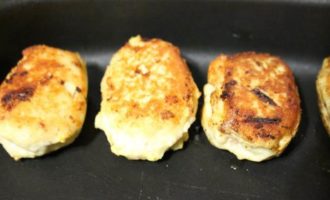 • Обжаренные котлетки складываем в форму для запекания. Добавляем воды совсем немного, чтобы только закрыть дно формы.